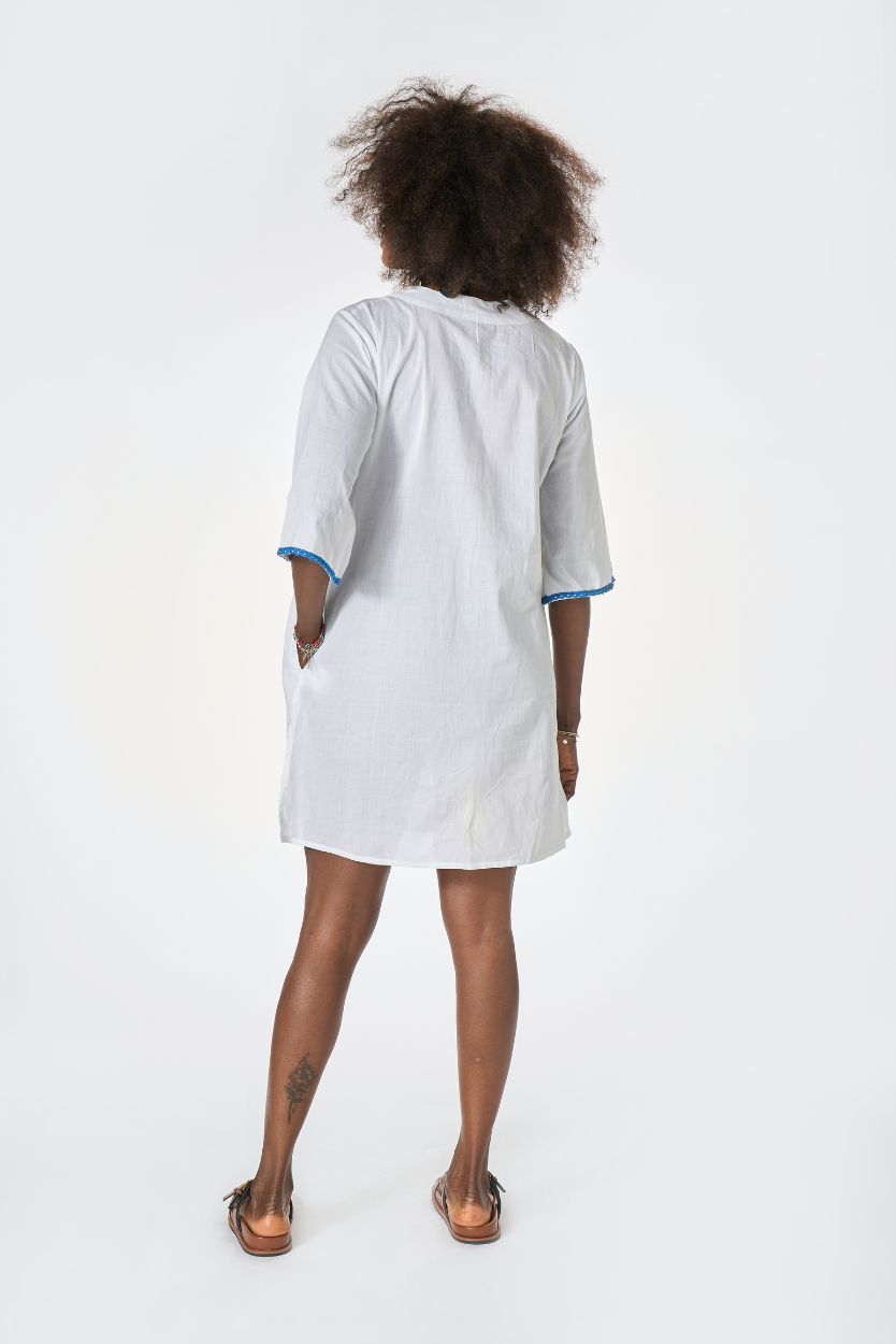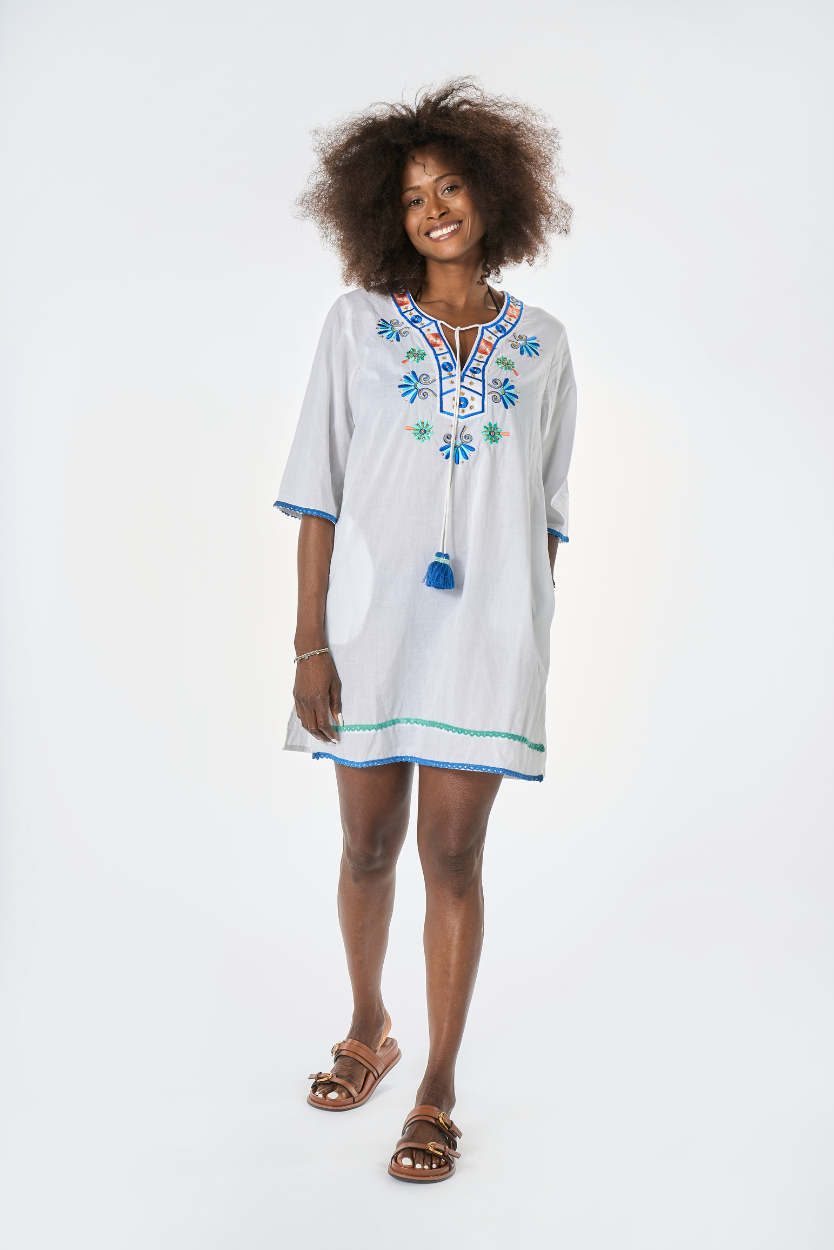 Caftano ricamato con motivo floreale che richiama le culture del Sud America. Puro cotone 100% con comode tasche e maniche a tre quarti. Fiocchi fatti a mano.