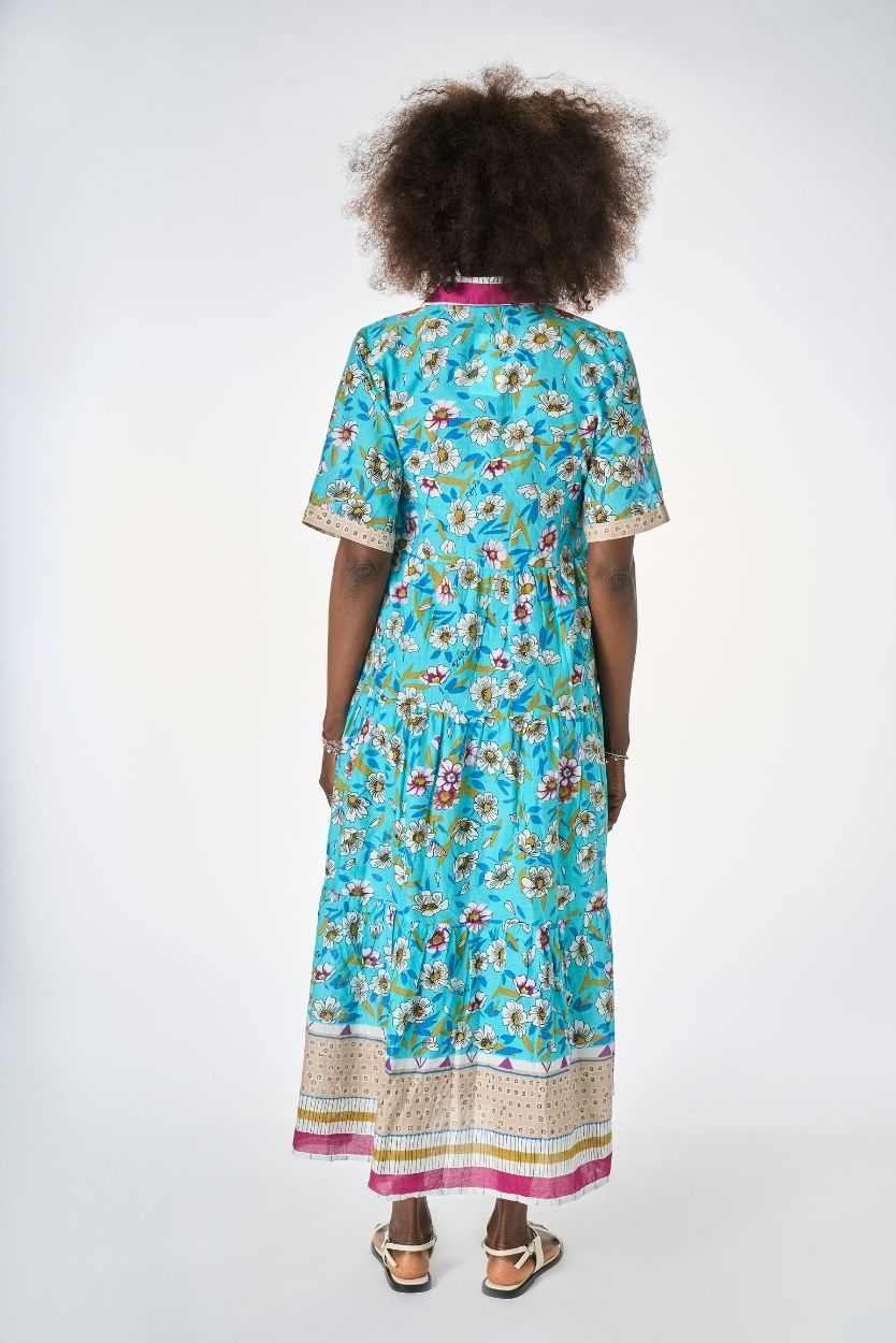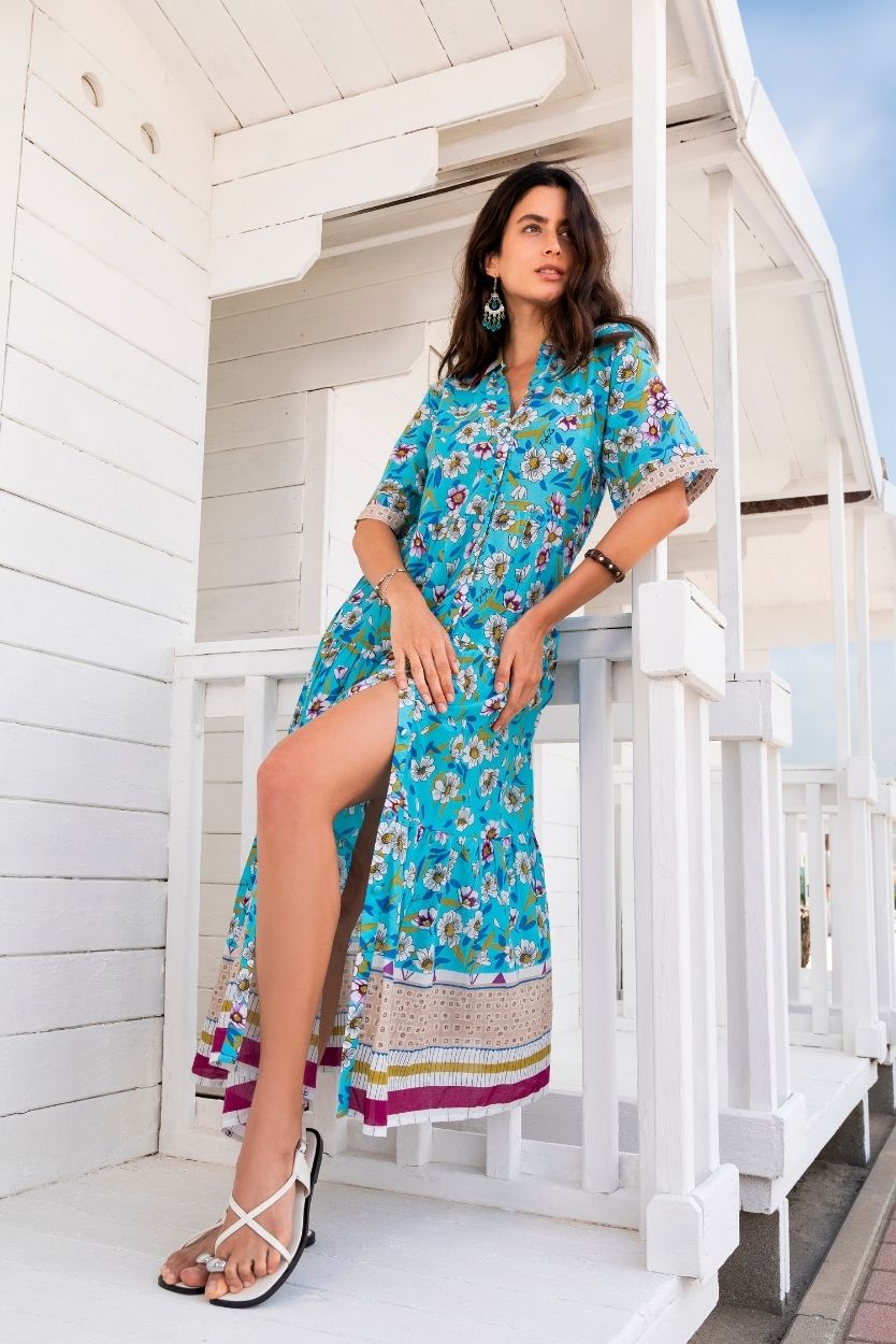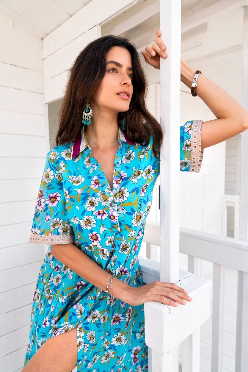 Abito lungo 100% cotone, aperto con bottoni. Comode tasche.